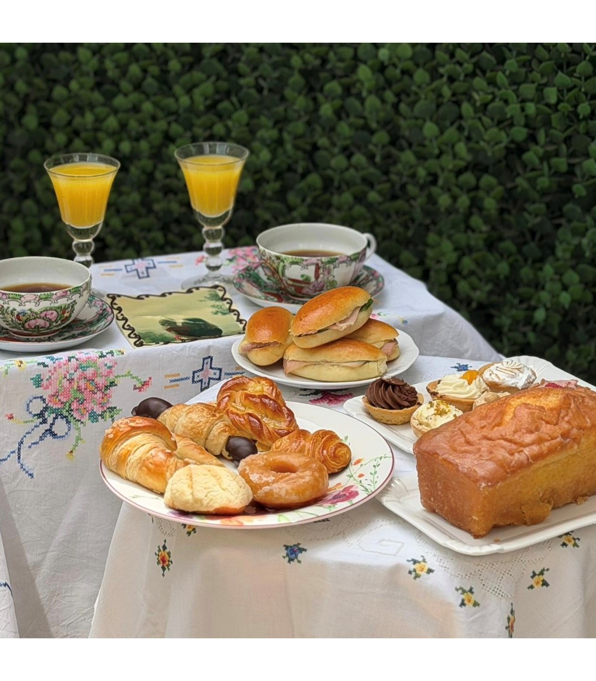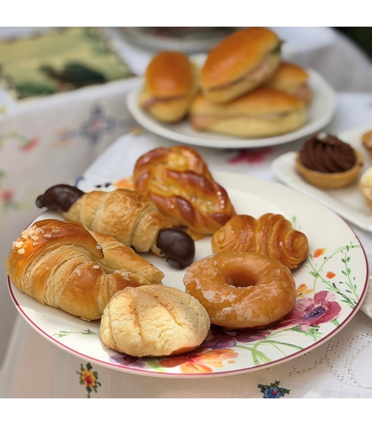 - Una bandeja de 6 piezas de bollería mini variada: 1 croissant, 1 croissant de chocolate, 1 mují, 1 mariposa, 1 donuts glaseado y 1 conchita.