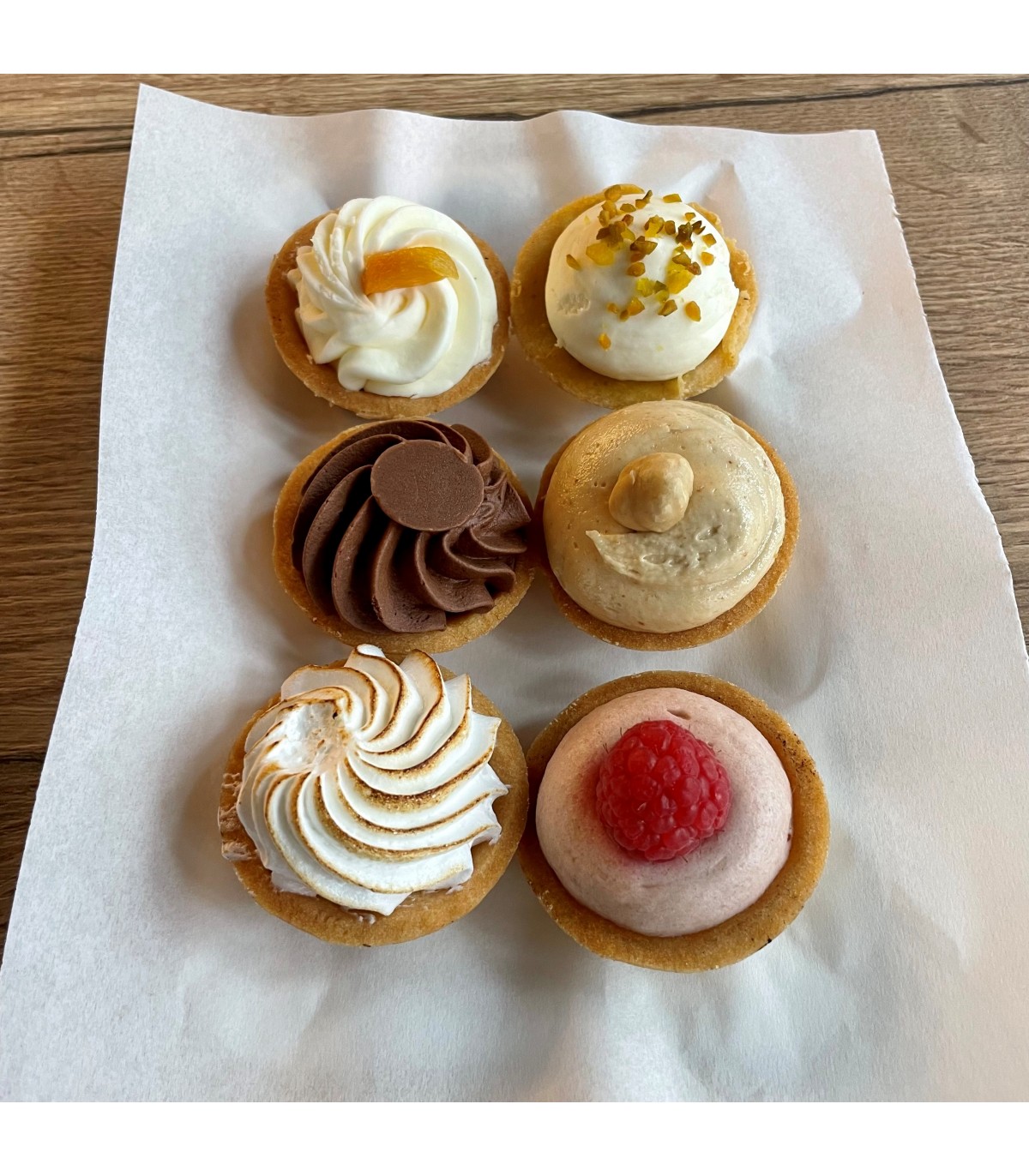 - Seis tartaletas mini de pasta brisa: limón y merenge, frambuesa, avellana, chocolate y crujiente de almendra, melocotón y queso mascarpone, pistacho y chocolate blanco.