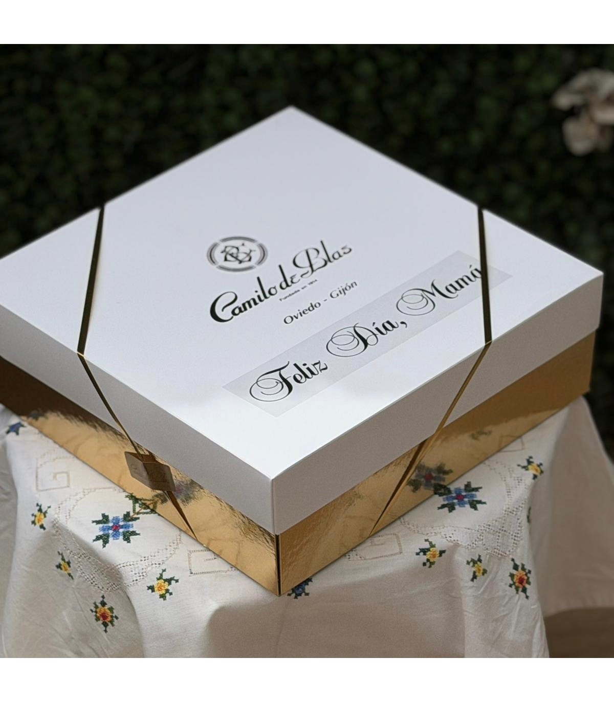 - Caja convertible en mantel con frase "Feliz Día, Mamá": incluye una servilleta con lazo y un sobre con mensaje(*)