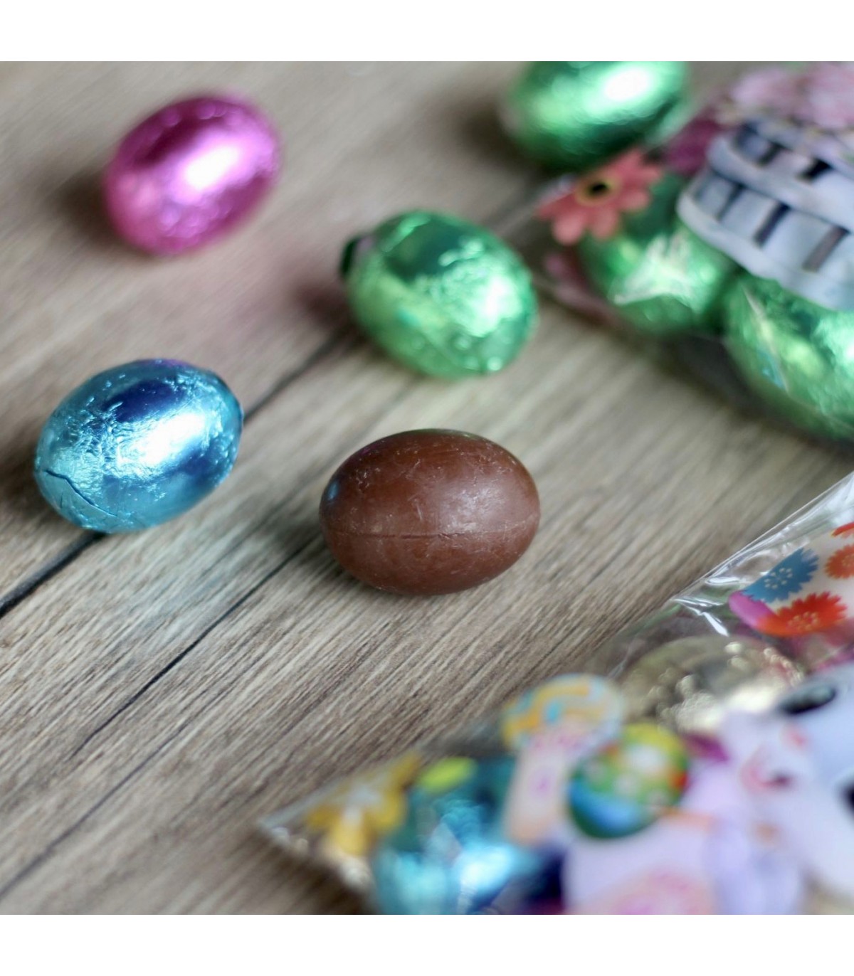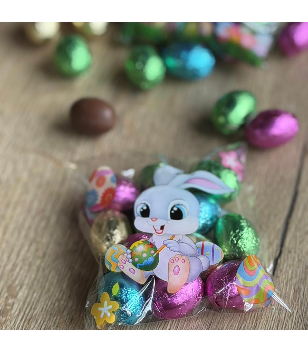 Bolsita con 12 unidades de huevitos de chocolate rellenos de praliné.