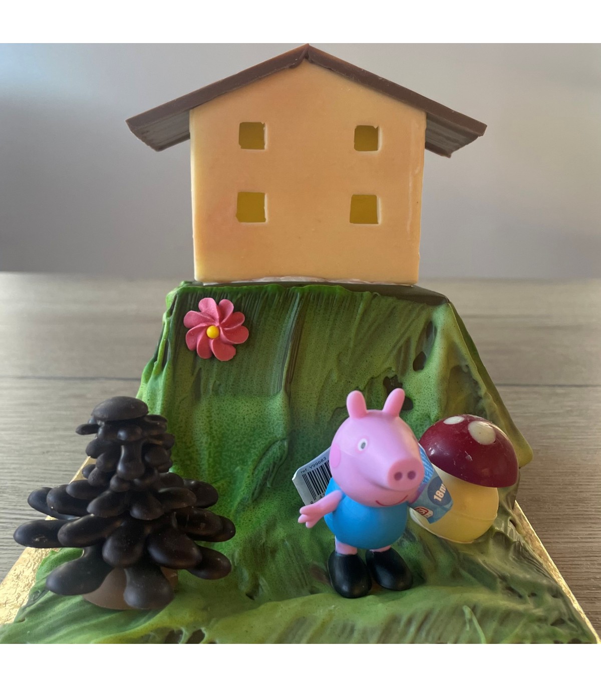 Casita de chocolate blanco con tejado y terreno de chocolate con leche. Decoraciones en varios chocolates.