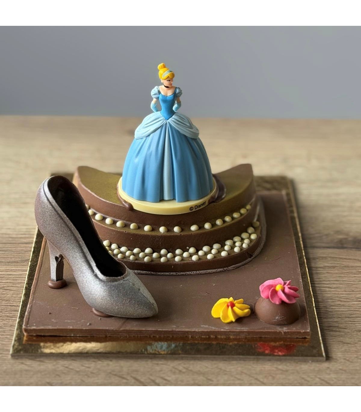 Base, escaleras y zapato de chocolate con leche. Flores de azúcar.