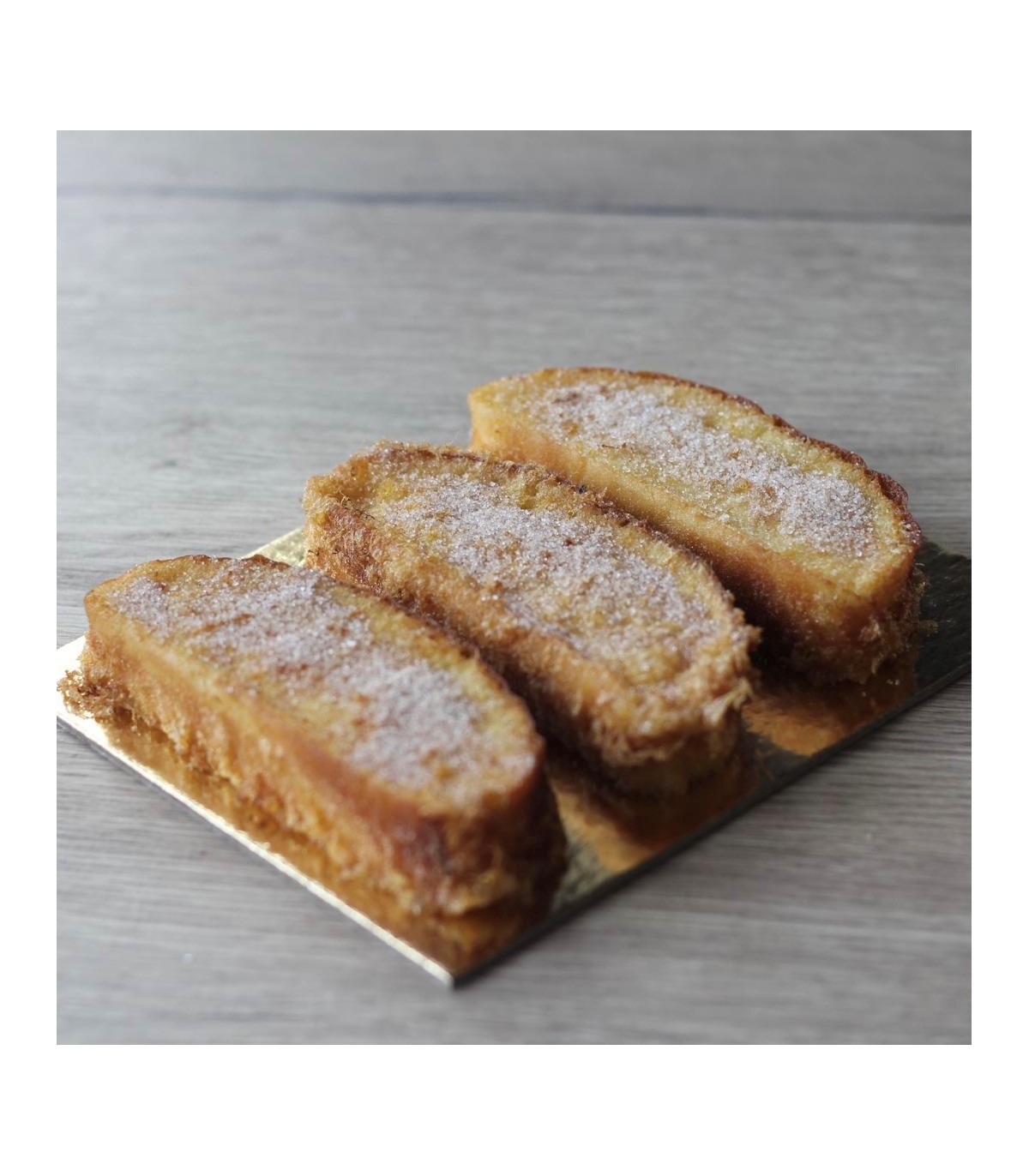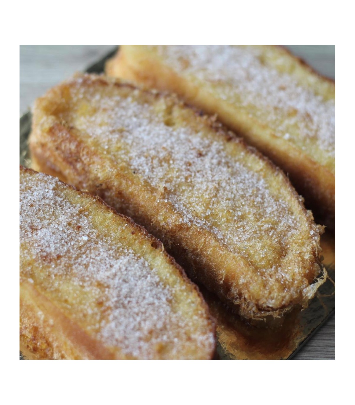 Pan suizo bañado en leche y frito en aceite de oliva, cubierto con azúcar.
