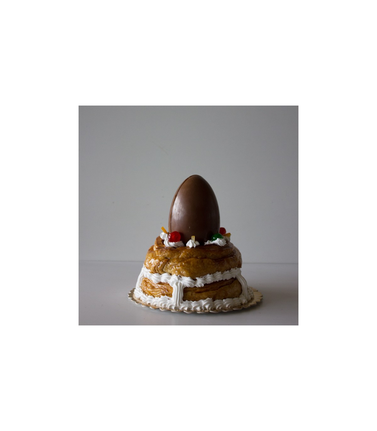 El conjunto se completa con un huevo de chocolate de 250g a escoger (chocolate con leche, blanco o negro) y se decora con merengue y frutas confitadas.