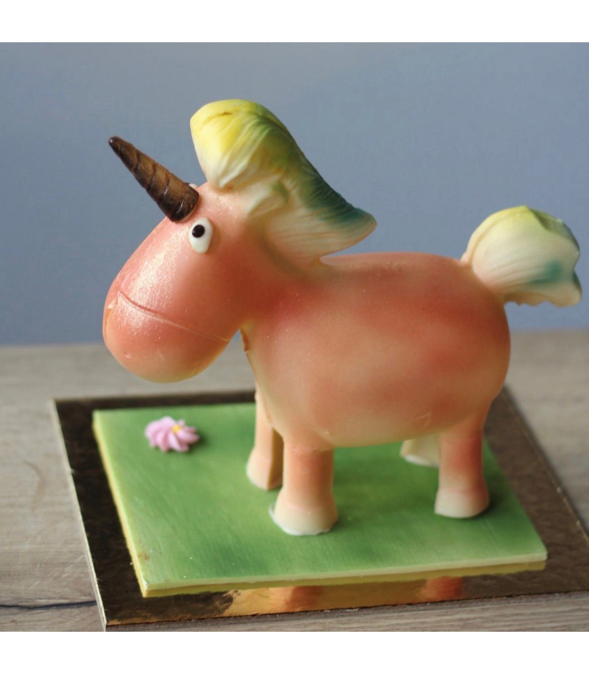 Unicornio de chocolate blanco sobre base de chocolate blanco pintado y cuerno de chocolate con leche.