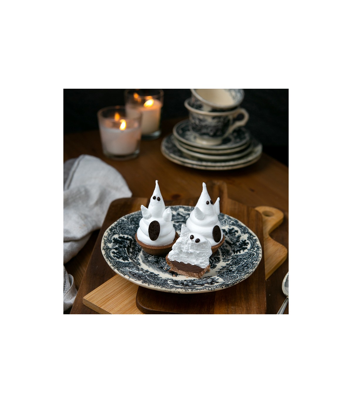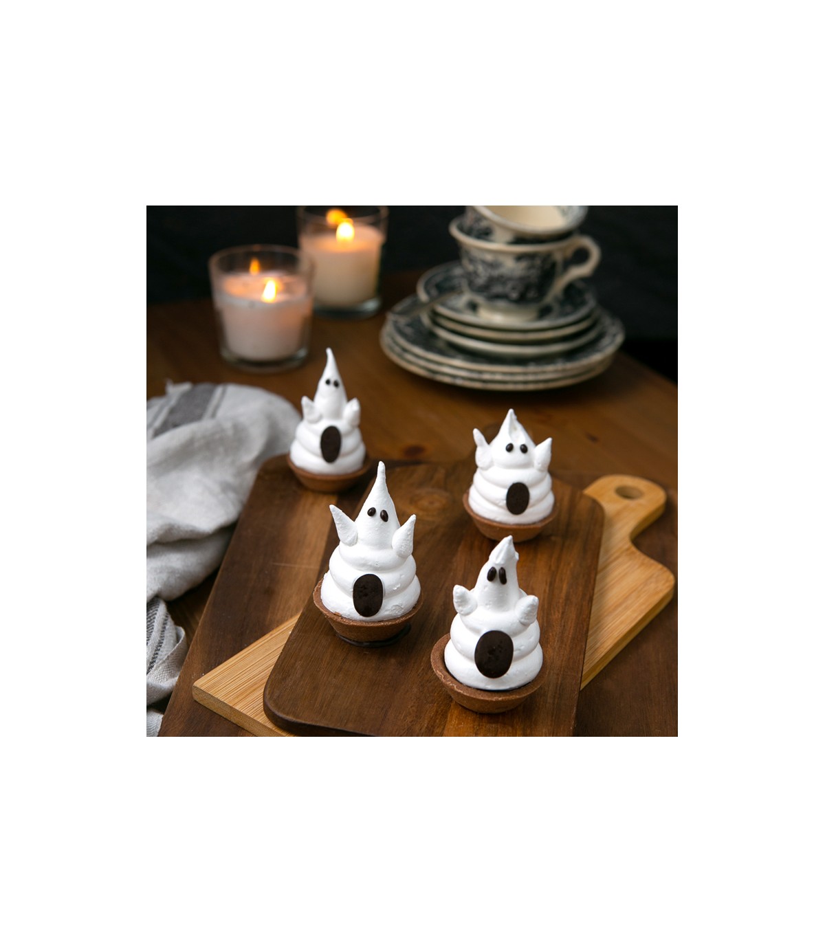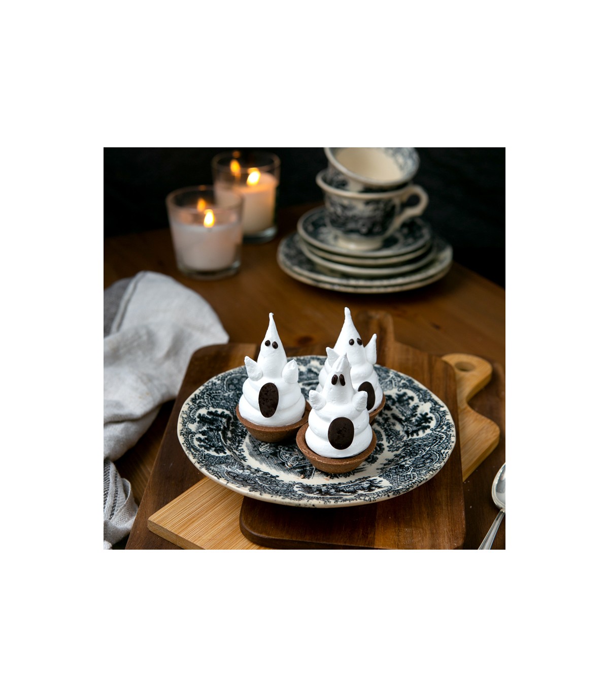 Tartaleta rellena de crema de chocolate y cubierta de merengue con forma de fantasma.